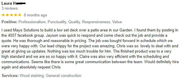 Need a new and safer balustrade on your deck or staircase? Perhaps you want to make your yard area more usable via a retaining wall or replace that dangerous, aging deck. If you have carpentry jobs around the home that you don’t have the time or skill to undertake yourself, the team at Mayo's can help.
